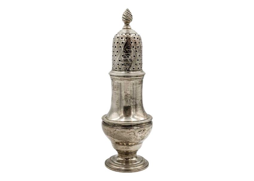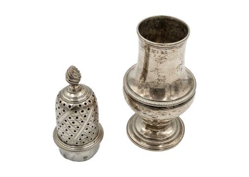 London 1763, of baluster form with a wrythen finial over the pierced and engraved lid, with beaded rims, makers mark to the lid flange, the inside foot with hallmark, height 20.5cm, 8.13 oz.