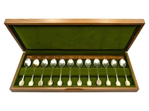 Made by John Pinchers, each of the twelve spoons with a different 24ct gold plated floral finial inset, Sheffield 1973, weight 10 oz.