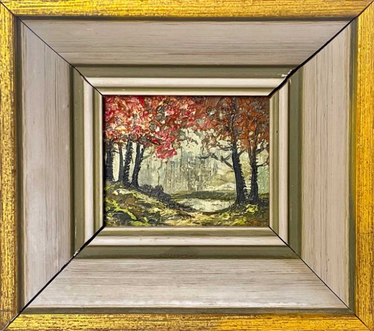 Oil on board,John Peak framer label verso, 6.5cm x 7.5cm, 10.5cm x 12cm framed.