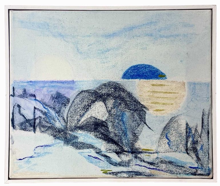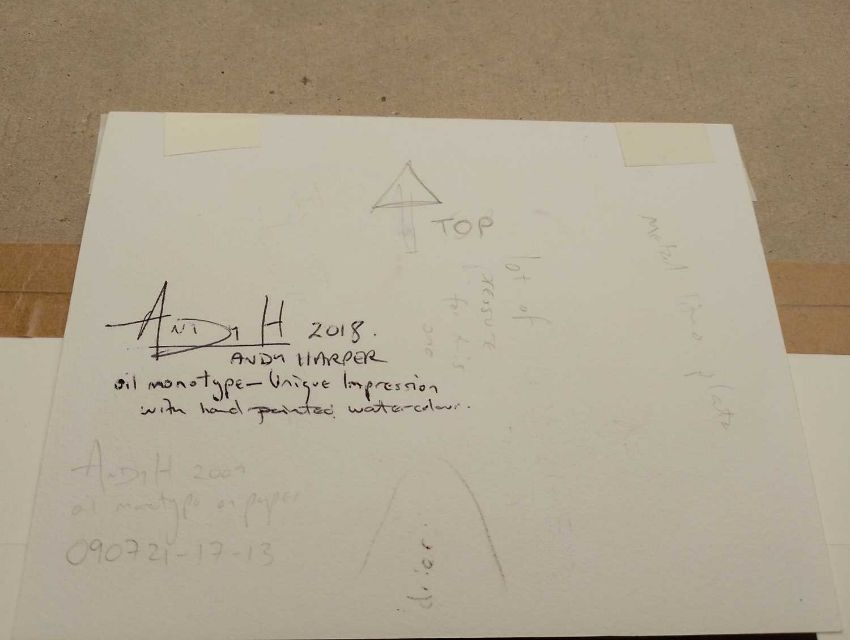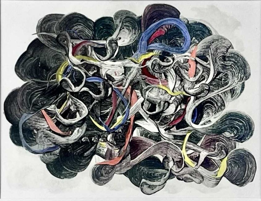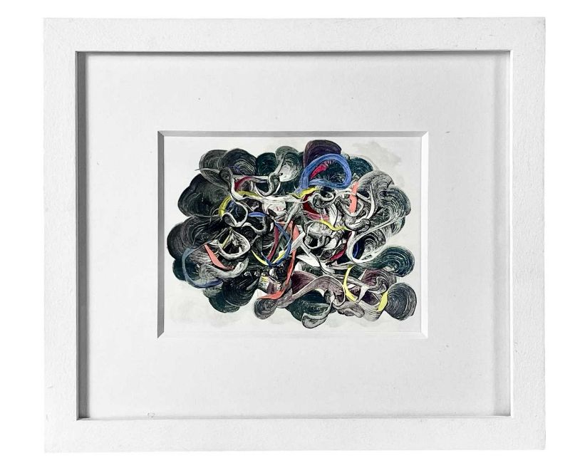 OIl monotype, a metal litho plate unique impression with hand-painted watercolour, signed and dated 2009 verso, 13cm x 17cm, 27cm x 31cm framed; together with a mixed media abstract on canvas, signed B, 26.5cm x 31.5cm framed.