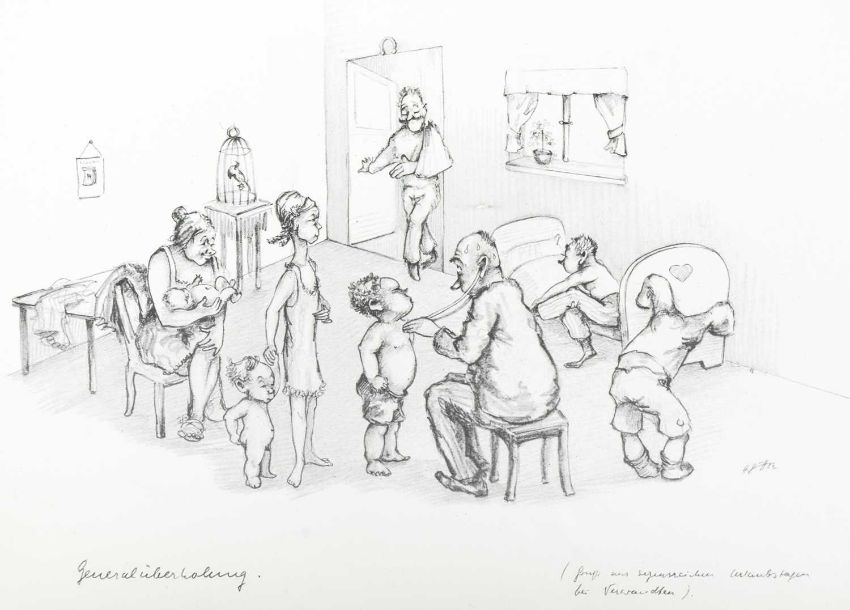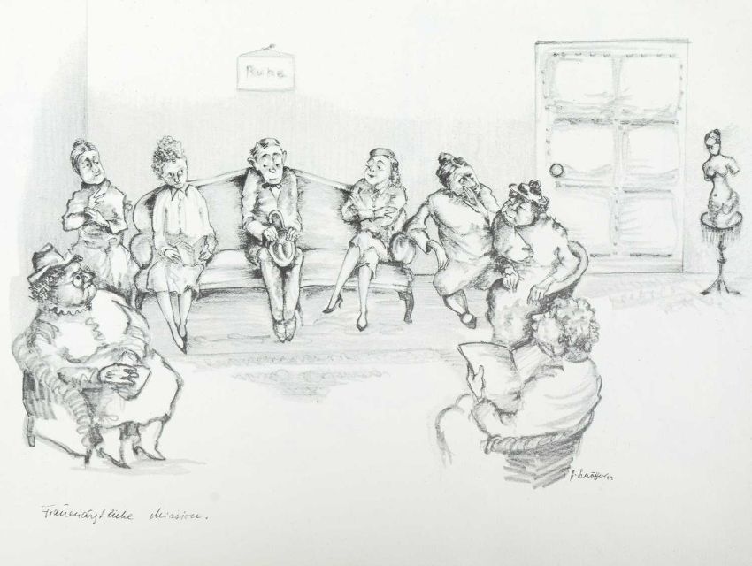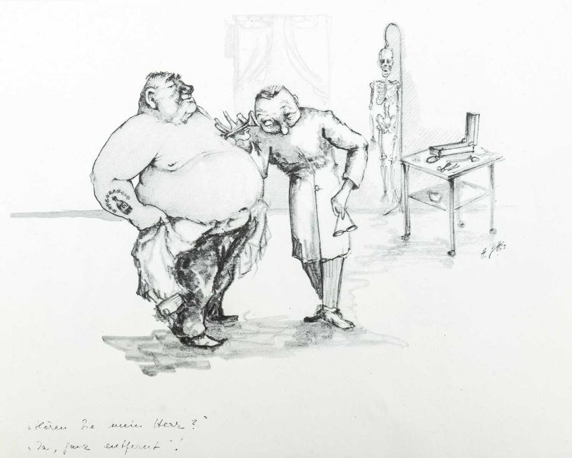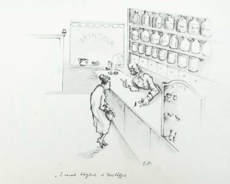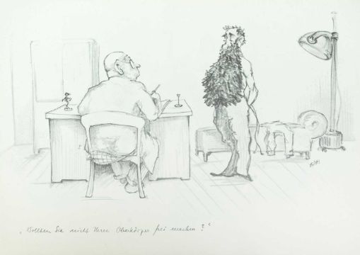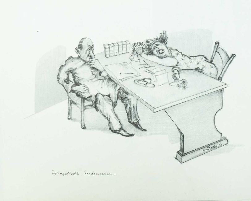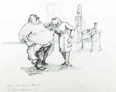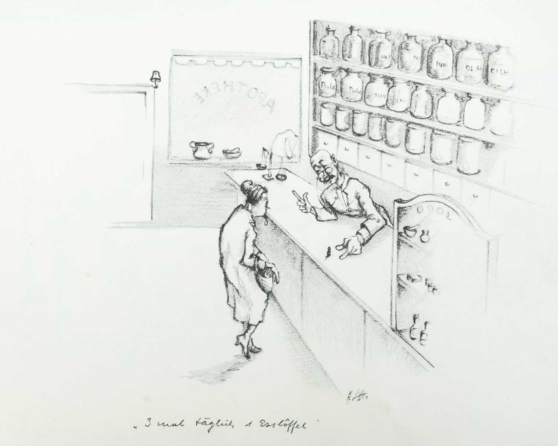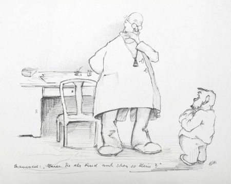 Print on paper, 22cm x 30cm, together wih Armin SCHAFFER (XX), Eleven Prints, Possibly from his book, 'Pills, Pulse and Professors', each 20.5cm x 29.5cm, an indistinctly signed etching and three other original works by different hands.