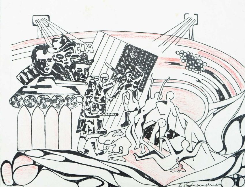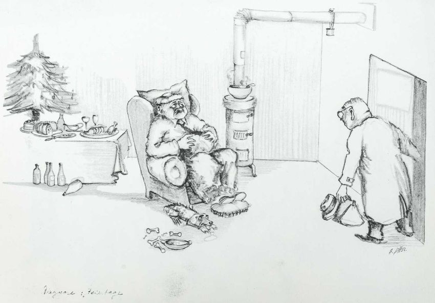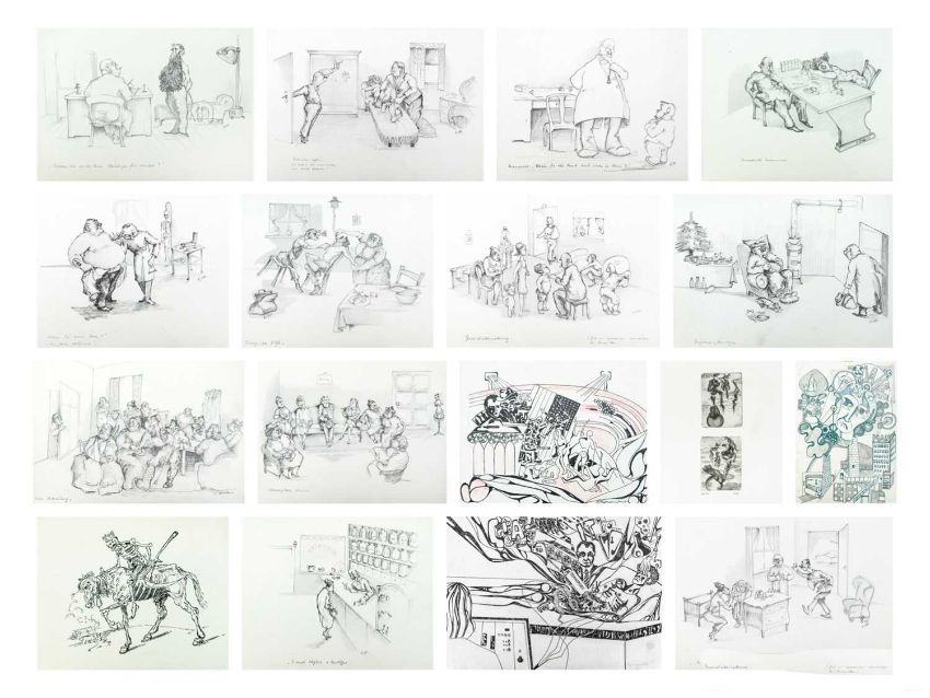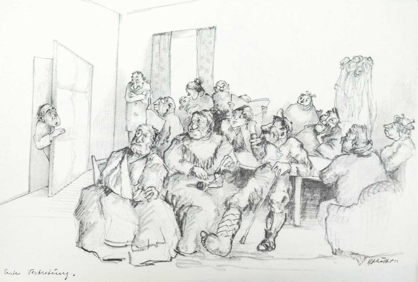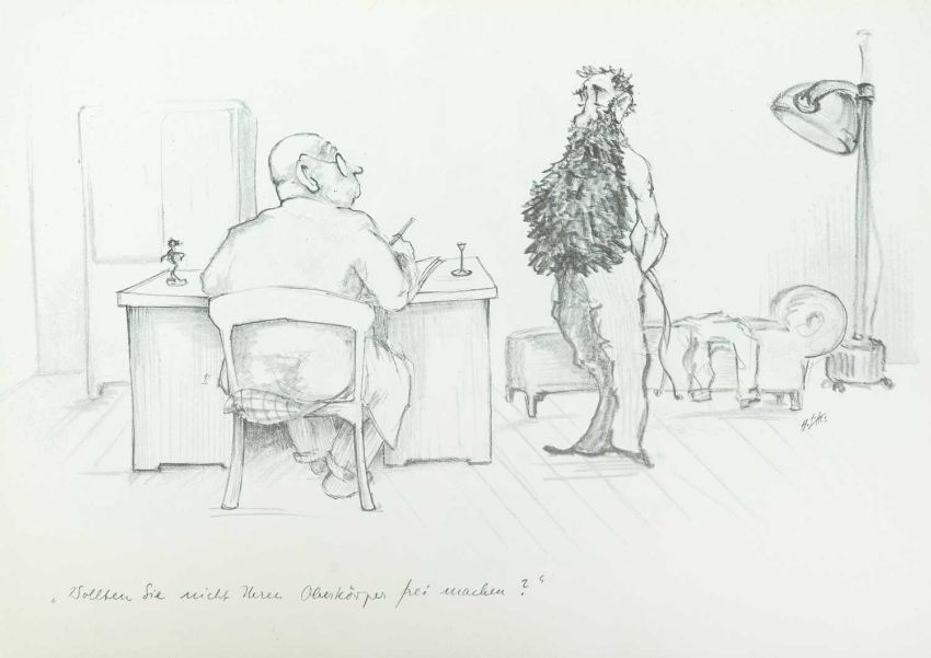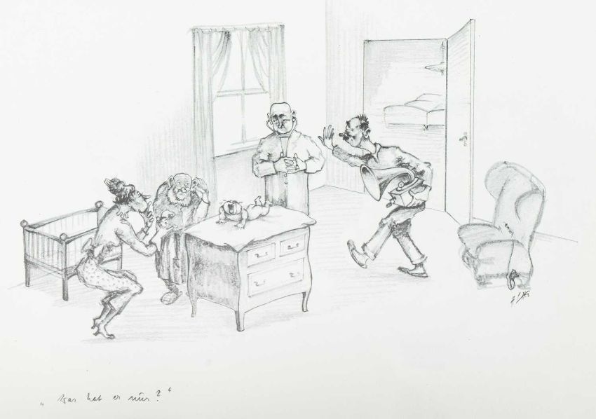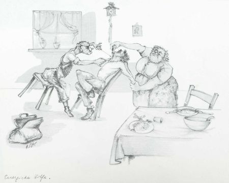 Print on paper, 22cm x 30cm, together wih Armin SCHAFFER (XX), Eleven Prints, Possibly from his book, 'Pills, Pulse and Professors', each 20.5cm x 29.5cm, an indistinctly signed etching and three other original works by different hands.