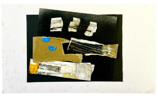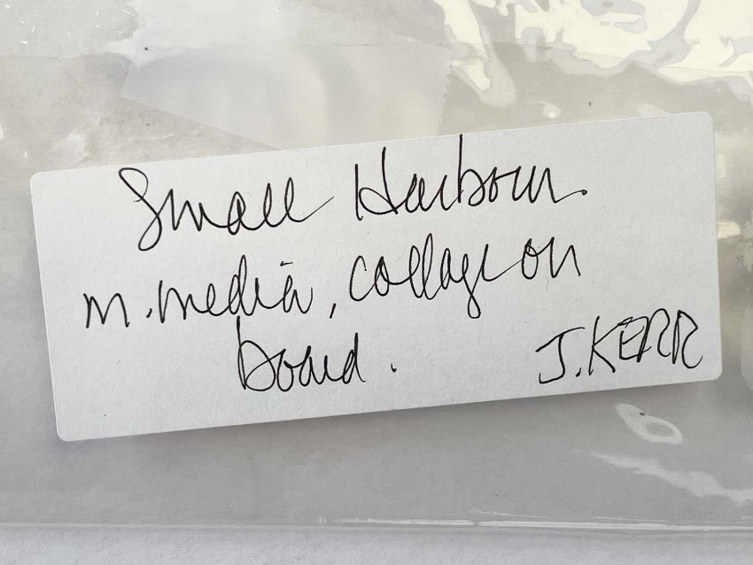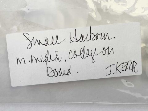 Mixed media and collage on board, signed and titled to label verso, 20.5cm x 25cm irregular.
