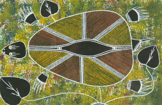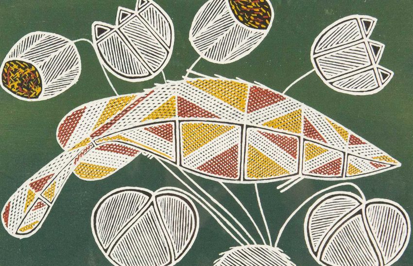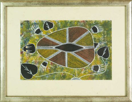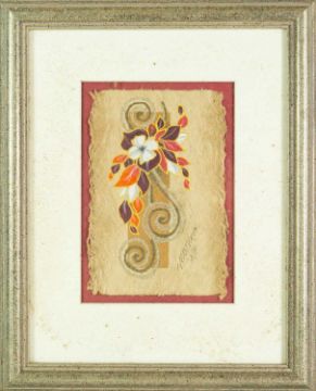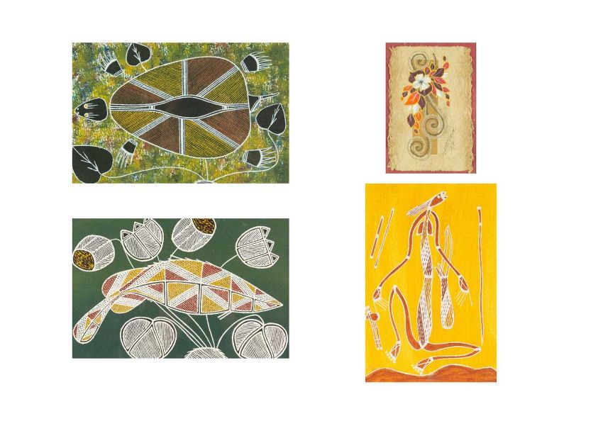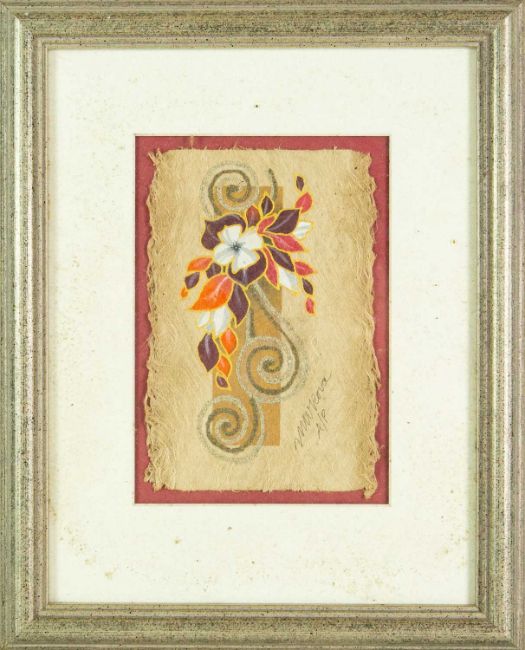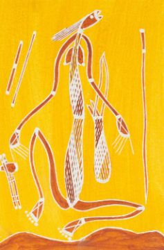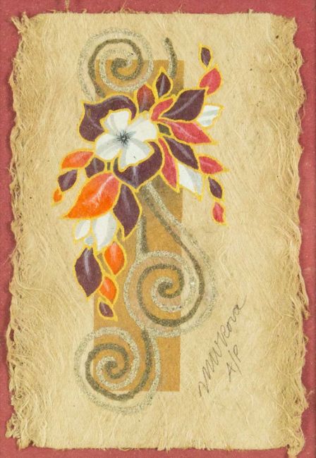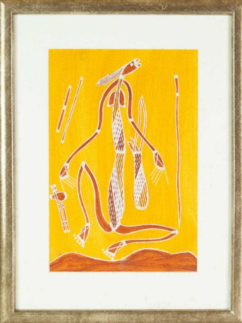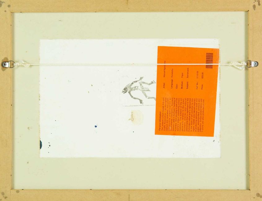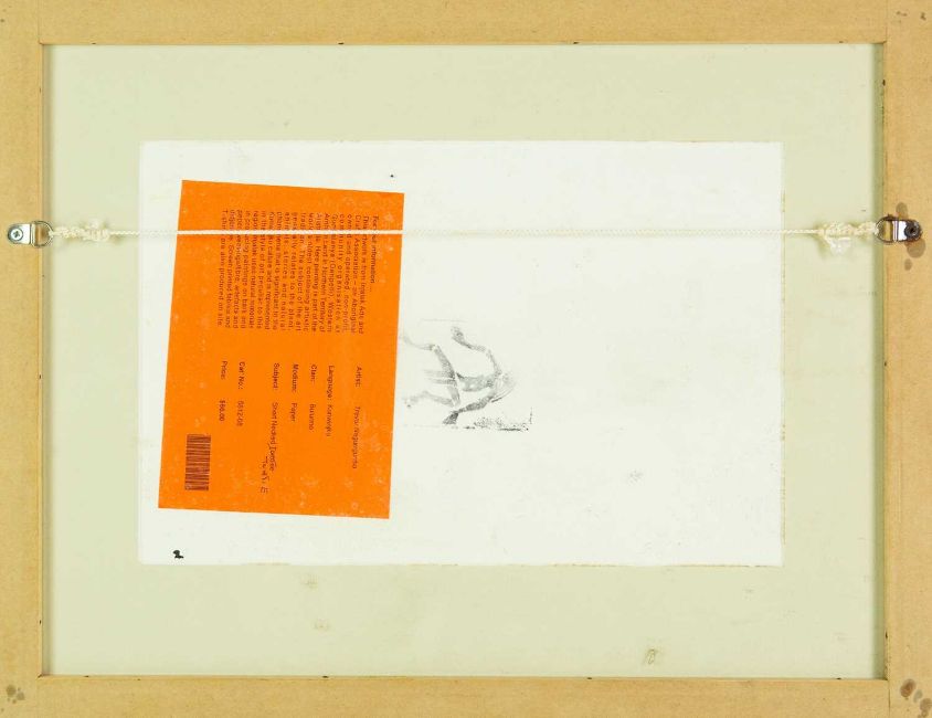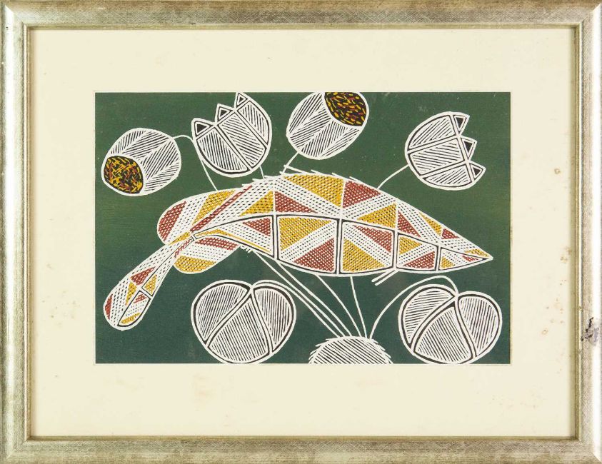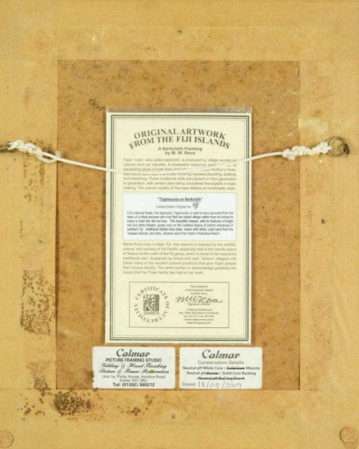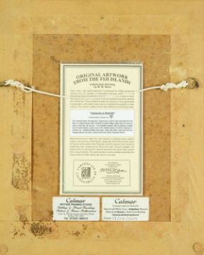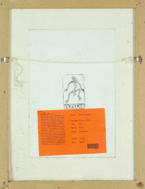 Natural materials on paper, studio stamp and artist's information verso, 29.5cm x 19.5cm, framed 43.5cm x 34cm; together with two further original works from the Injalak Art and Crafts Association by Maxwell Garnarradj titled Mimi Hunting, and Manuel Nganjmirra titled Barramundi each with the same proportions; and one further Fijian barkcloth painting titled Tagimoucia on Barkcloth, artist's proof limited edition original by Maria Rova. (4)