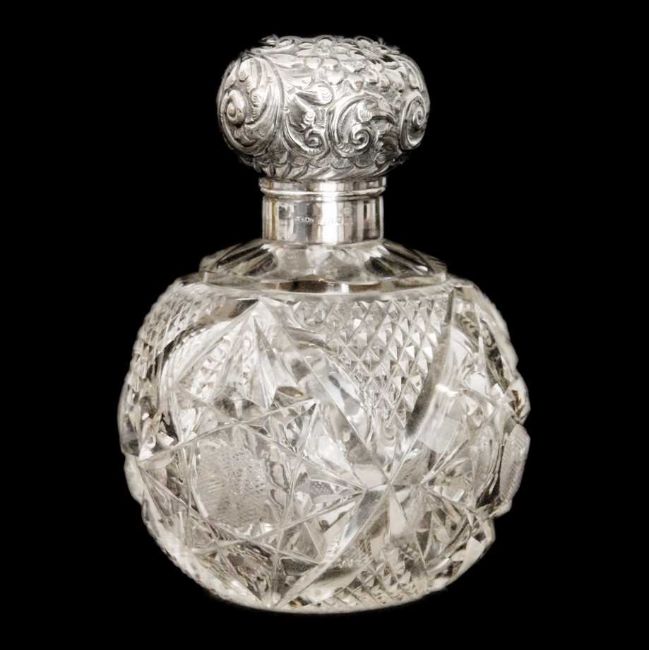 The ovoid embossed hinged lid enclosing the original glass stopper, Chester 1899, height 15.5cm.
