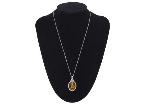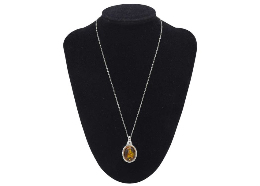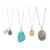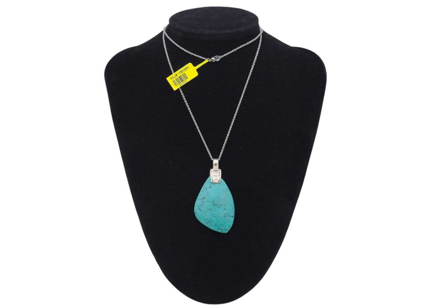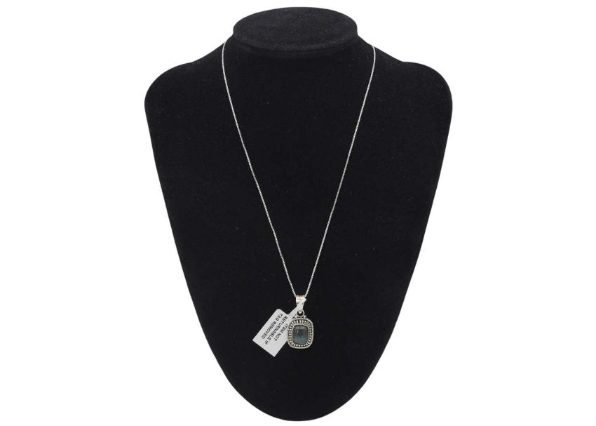 Including an amber pendant on 18" cable chain; a large labradorite pendant on 24" rope chain; a large turquoise pendant on 22" cable chain; and a labradorite in a silver frame pendant on a 18" box chain, all stamped 925.