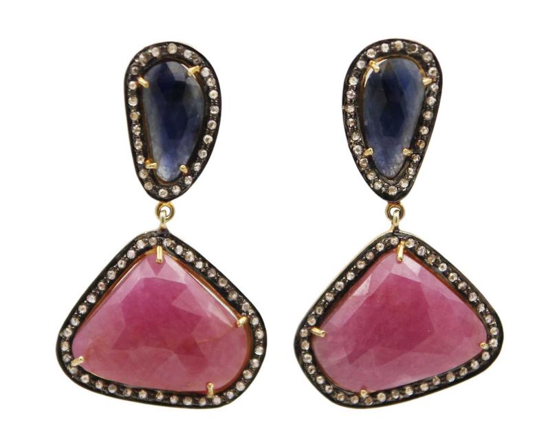 Set with large rose-cut sapphires and rubies, surrounded by melee rose-cut diamonds, the earring drops 5cm, and the total weight is 17.95g.