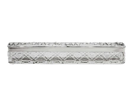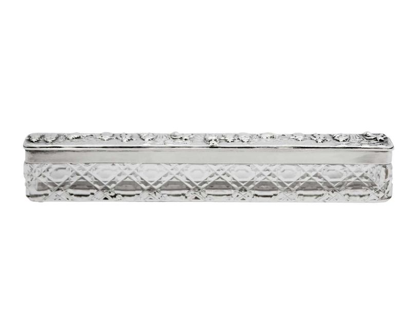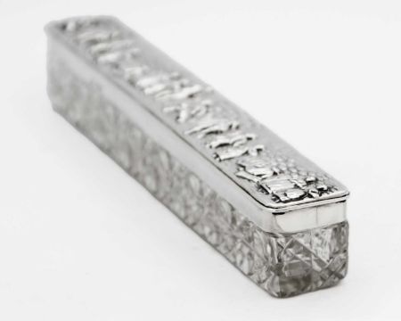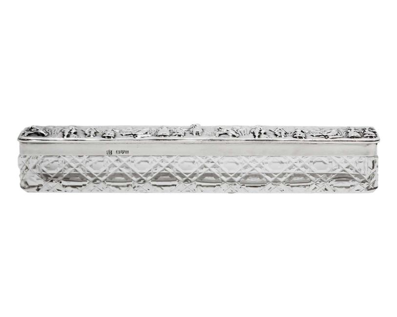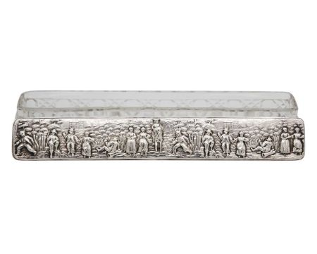 By George Nathan & Ridley Hayes, the lid embossed and chased with revellers, Chester 1906, length 22.5cm, weight of lid 2.00 ozt.