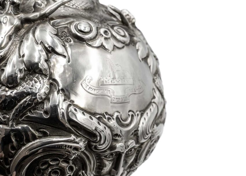 The cartouche engraved 'LADIES CHALLENGE PLATE PRESENTED TO THE VOLUNTEER BATTALION THE MANCHESTER REGIMENT 1906' the opposing cartouche with Manchester Regiment armorial.
