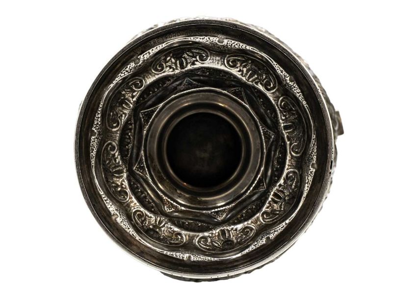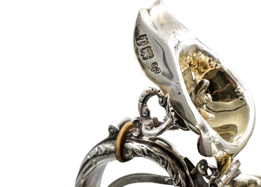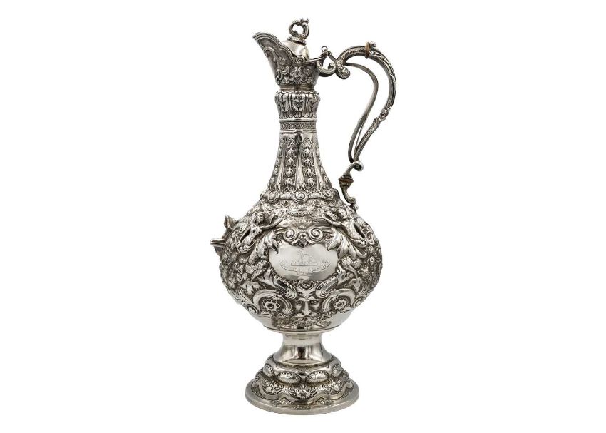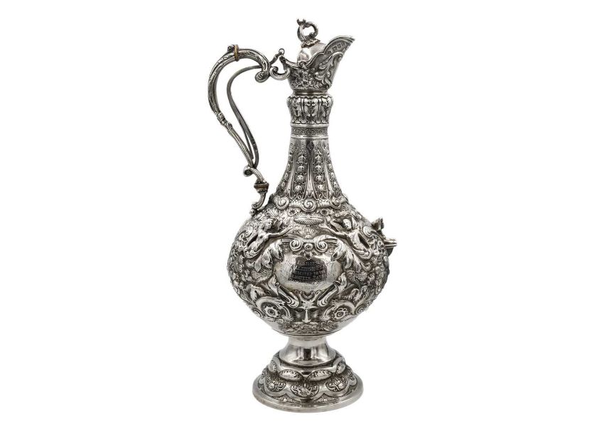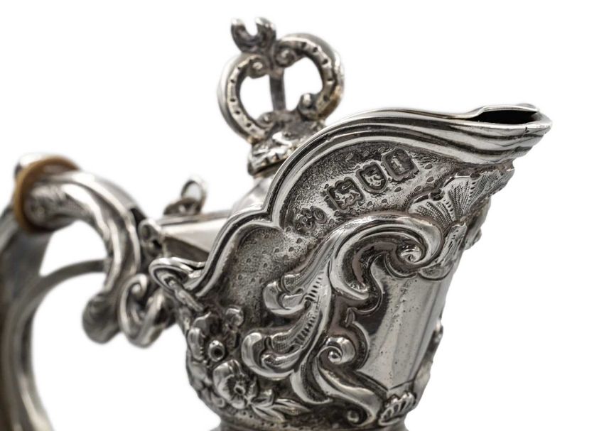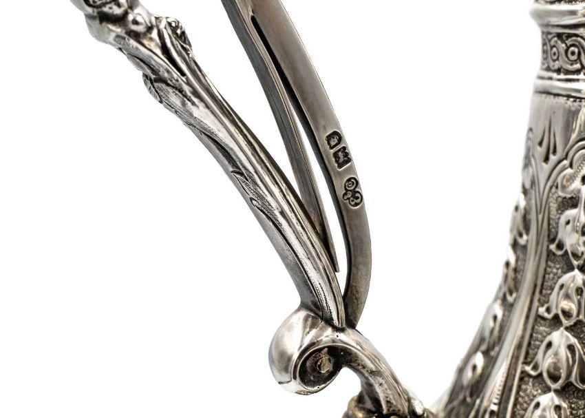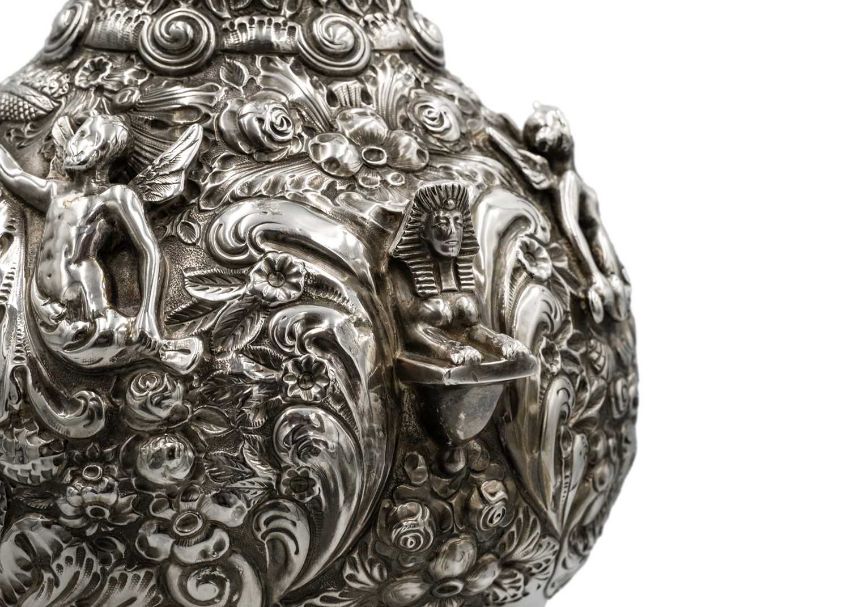 Of typical form with spring-action scroll handle, with ivory insulators, elongated shaped neck with bands of acanthus leaves and flowers, the bulbous body chased and embossed with flowers and leaf scrolls around two cartouches, the cartouches flanked with applied male and female winged figures, a protuding Sphinx and masks, on a spread circular foot, height 40cm, London 1906, 41.95 oz. Ivory exemption no. CUCUTRU8
