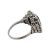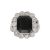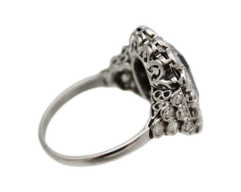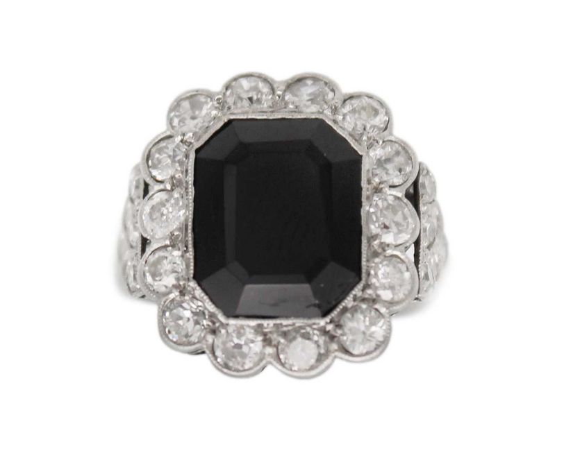 An emerald-cut onyx is 11.5mm x 9.5mm, surrounded by white, clear, round, brilliant-, English round-, and a single-cut diamonds. The ring's head is 18mm x 16mm, unmarked, and the total weight is 6.34g.
