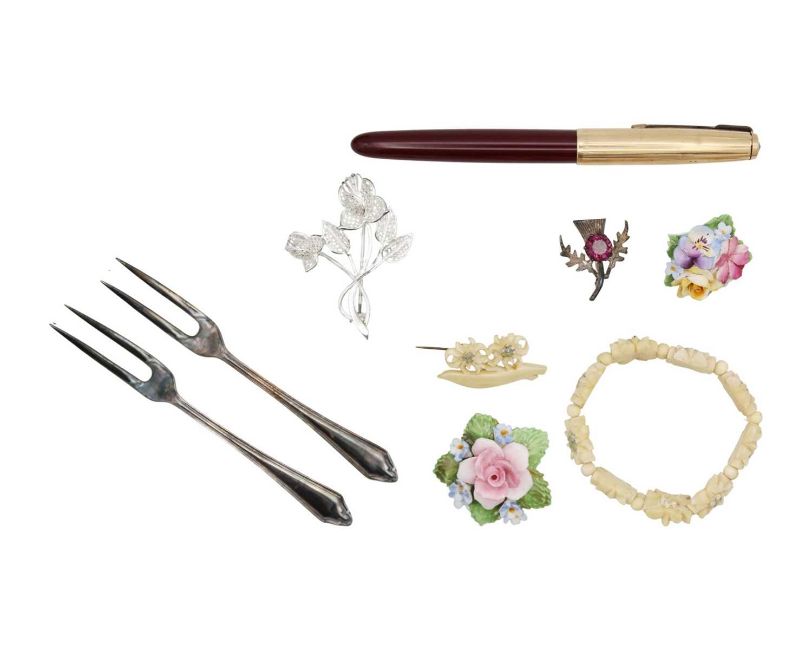 To include a silver gatelink bracelet, a Scottish silver and paste thistle brooch, a silver filigree flower spray brooch, a Parker fountain pen within box, etc. The longines Presence quartz within original box.