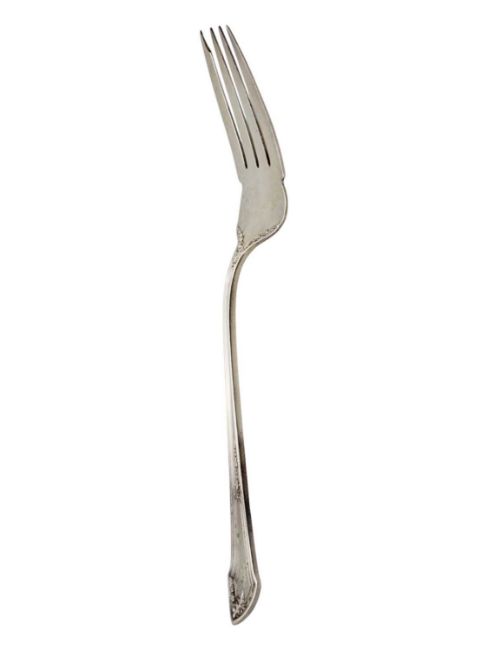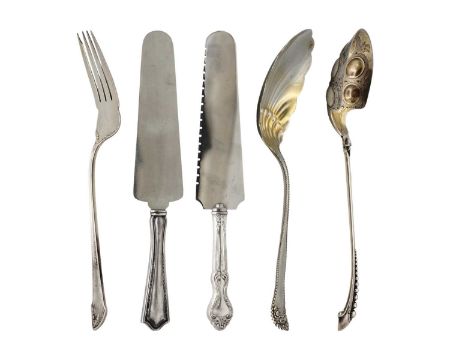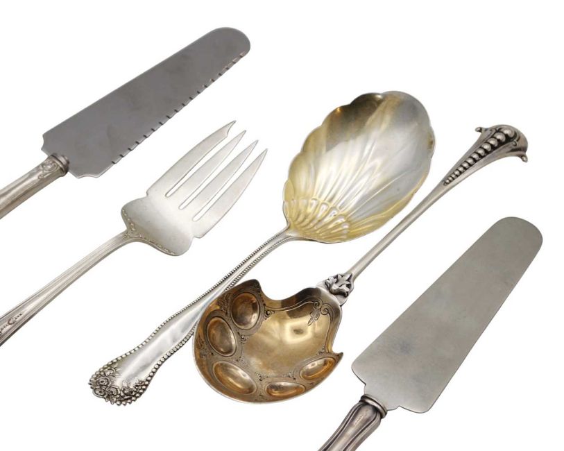 The spoon with scallop shell gilded bowl and foliate and bead cast handle, by Gorham & Co, length 23cm, the fork by Harris & Shafer, length 22cm; the white metal spoon with gilded bowl, tests as silver, length 25.5cm. Total weight 228.4g; together with two silver handled cake slices (5)