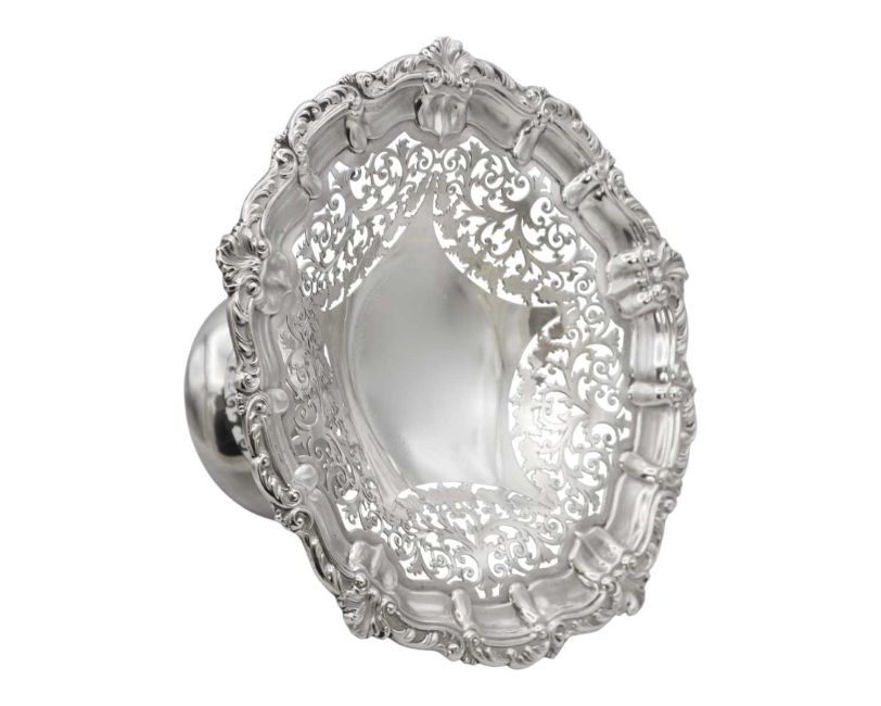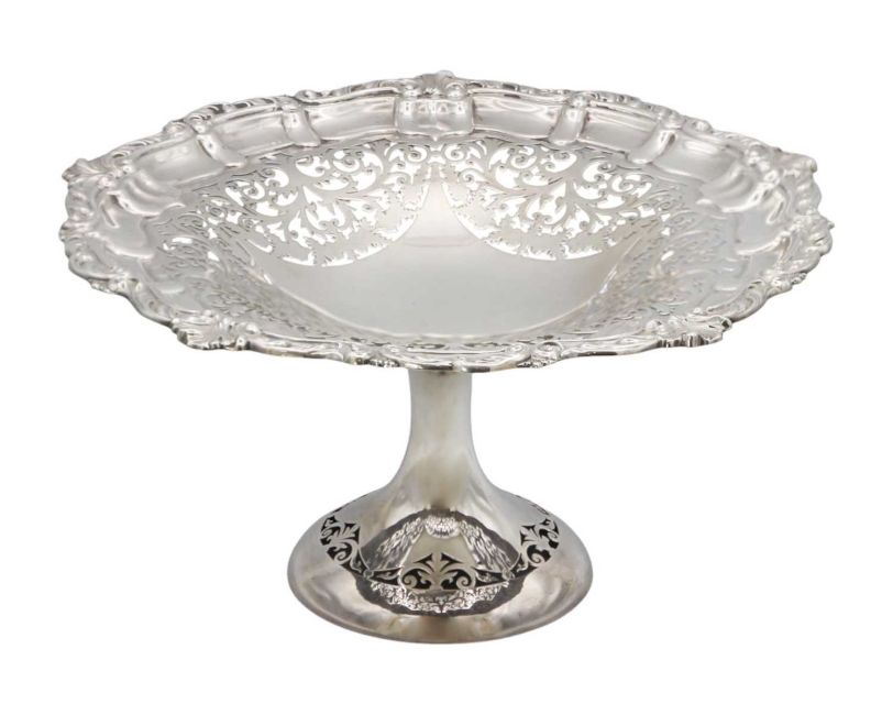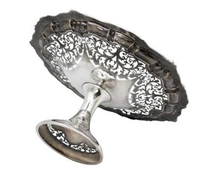 With leaf scroll cast pie crust rim and foliate scroll pierced dish, over a plain trumpet form pedestal with pierced foot, Birmingham 1900, diameter 29.5cm, height 15.5cm, 23.0 ozt.