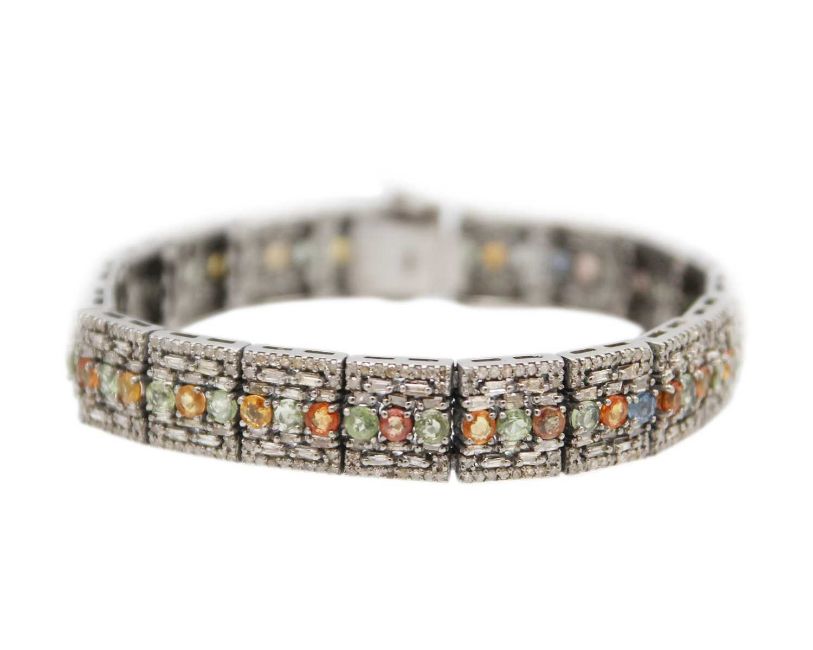 Set with multicolored round sapphires and mixed cut diamonds, fitted with an open box clasp and a double safety catch, the length is 7", width 11mm, stamped 925, and the total weight is 30.45g.