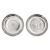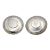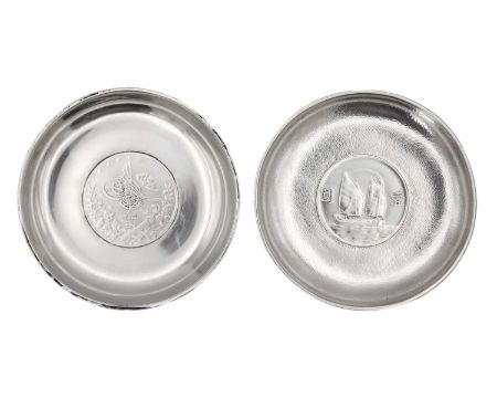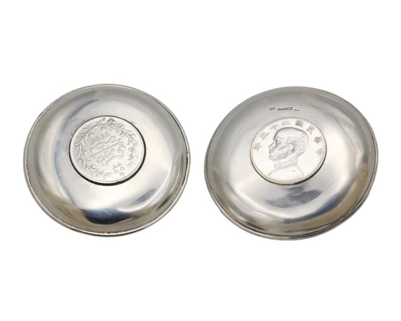 One dish inset with a Chinese 'Junk' dollar, the dish back stamped 'STERLING' and makers mark C.J, diameter 9cm; the other dish set with an Egyptian 10 Qirsh, diameter 9cm. Total weight 147.4g.