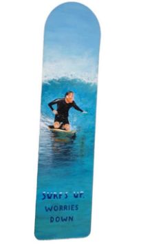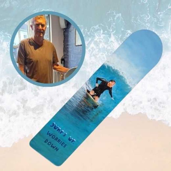 His board painting pays tribute to one of his friend’s sons – Kyle who sadly passed away in January 2024. Kyle’s father Glyn asked Mark to paint him on the board from a photo of him surfing, the hobby he loved.