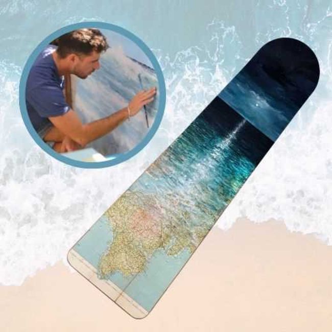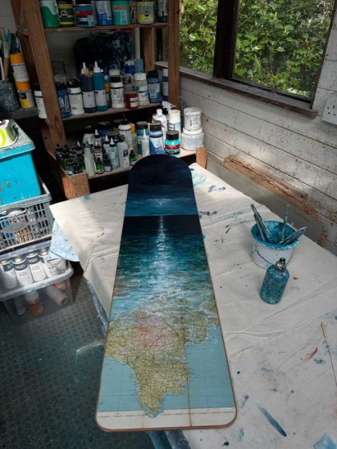 Finished size 1220 x 298 mm (+/- 4 mm). Each board is crafted from Okoume 7 ply hardwood 9mm thick and is sustainably sourced from Lloyds approved timber mills. It has terrific natural graining, figuring and colouring. The boards have undergone a steam bending cycle on what must be the oldest Cornish Electro steam being press still operating today. They are then finished using Yacht and Seaplane marine finish and white spirit which gives a good penetration without clogging the pores of the wood. Finally the boards have been safety edge rounded and hand-sanded – this opens up the grain better to provide a bond with the finishing medium of choice by our artists.