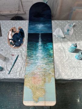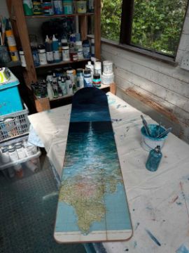 He uses mixed media including acrylic, oil and ink encourage him to push the technical boundaries of traditional landscape painting. Authentic vintage maps and other found objects are often used as the base for Kit’s art, creating a rare unique canvas for each painting.