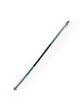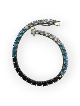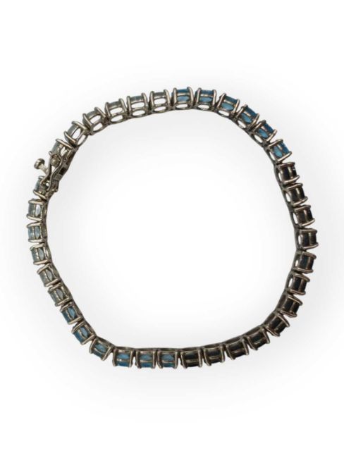 Set with Sky-, London-, and Swiss-blue oval mixed-cut topazes, 5mm x 4mm each, the length is 7 1/2", stamped 925, total weight is 12.05g.