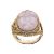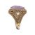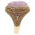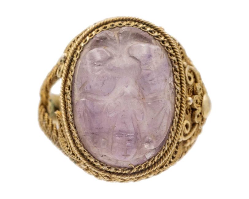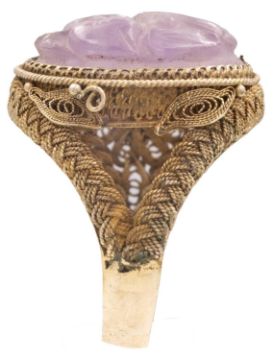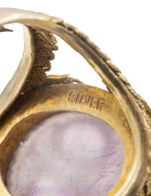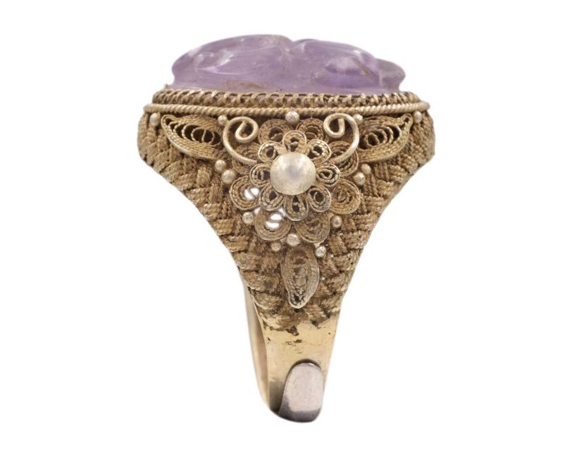 Of filigree metal work, the oval carved cabochon amethyst is 2cm x 1.5cm, the ring is in size R, stamped SILVER, total weight 8.54g.