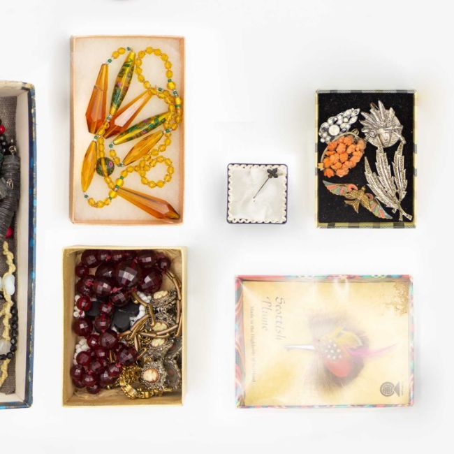 Including a French art-deco glass and rose flower carved bakelite bead necklace, paste and plastic beads, brooches, bracelets, etc.