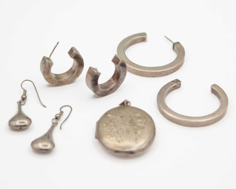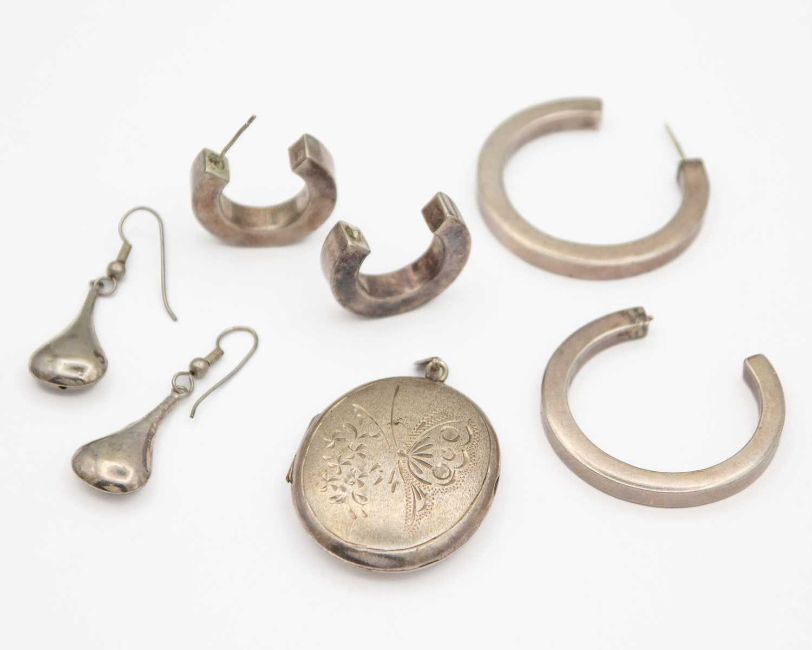 The two pairs of hoop earrings each with a broken post, the locket 34 x 40mm, total weight 34.5g.